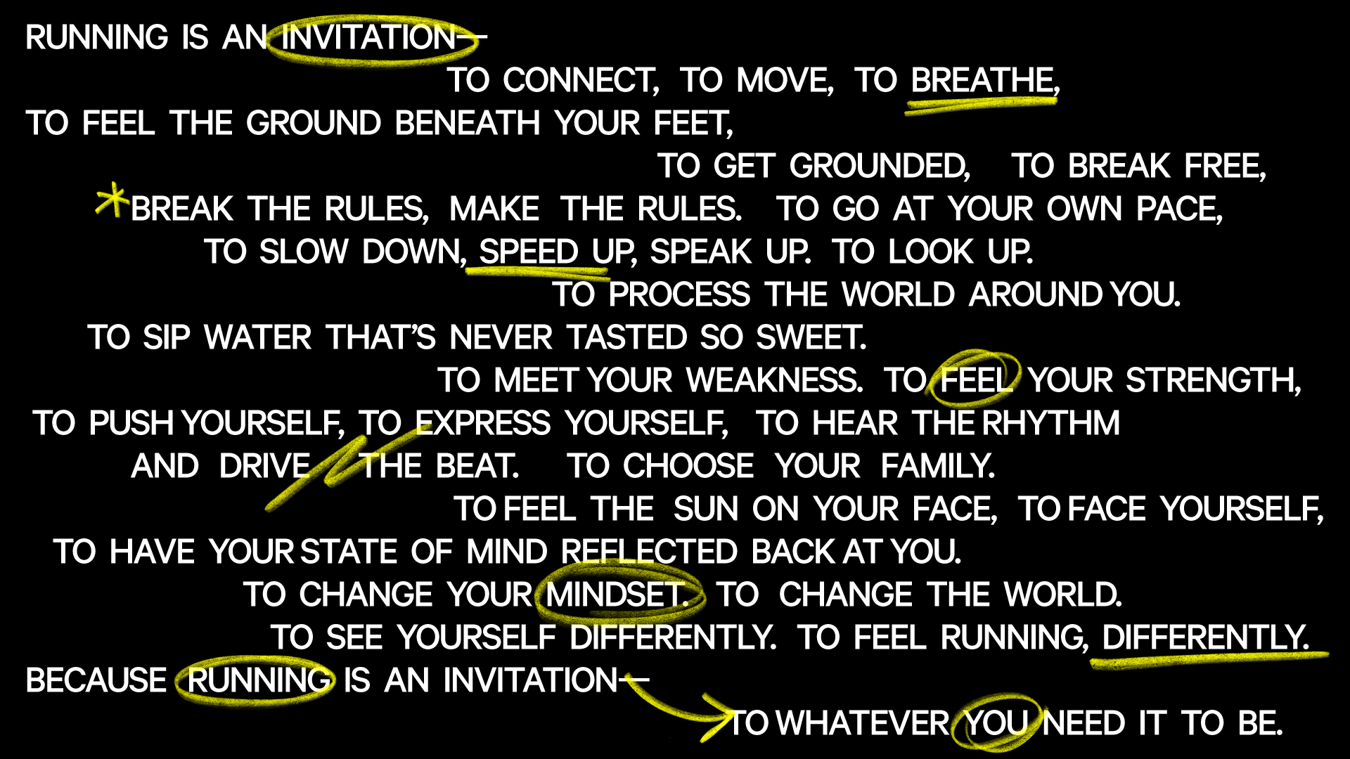 To move, to breathe, to feel the ground beneath your feet. To meet your weakness and feel your strength. To hear the rhythm and drive the beat. Running is an invitation—to whatever you need it to be.